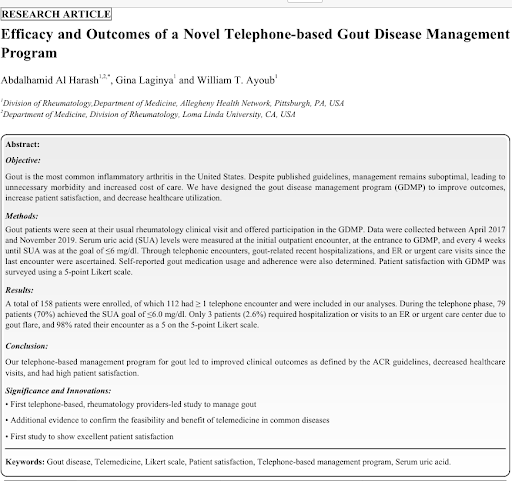 Al Harash, A., Laginya, G., & Ayoub, W. T. (2021). Efficacy and outcomes of a novel telephone-based gout disease management program. The Open Rheumatology Journal, 15(1), 51–56.